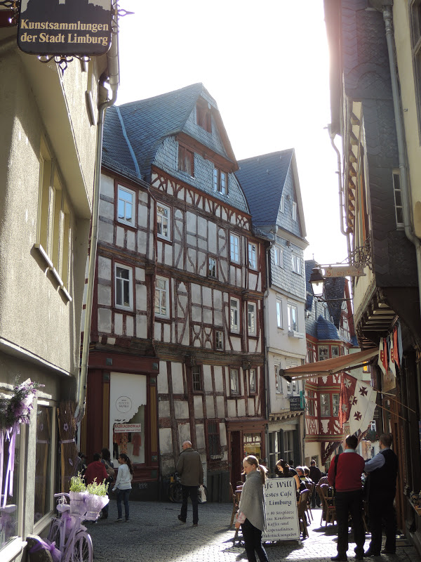 J was working furiously to get caught up and prepared for his upcoming presentation at the Max Planck and a conference in the US later this month, so with the weather promising to be really nice, I took the girls on a day trip to Limburg an der Lahn, about an hour's drive away. The Renaissance cathedral there is stunning and the day proved to be picture perfect. We also scored traditional German dresses, a wool coat for J, and a traditional linen dress for me at the Trachtenmode shop I stumbled on in the Aldstadt. Lunch out on the Marktplatz and later crepes with Nutella as we wandered through the Aldstadt. Home again in the afternoon and repacking for our trip to Hamburg...