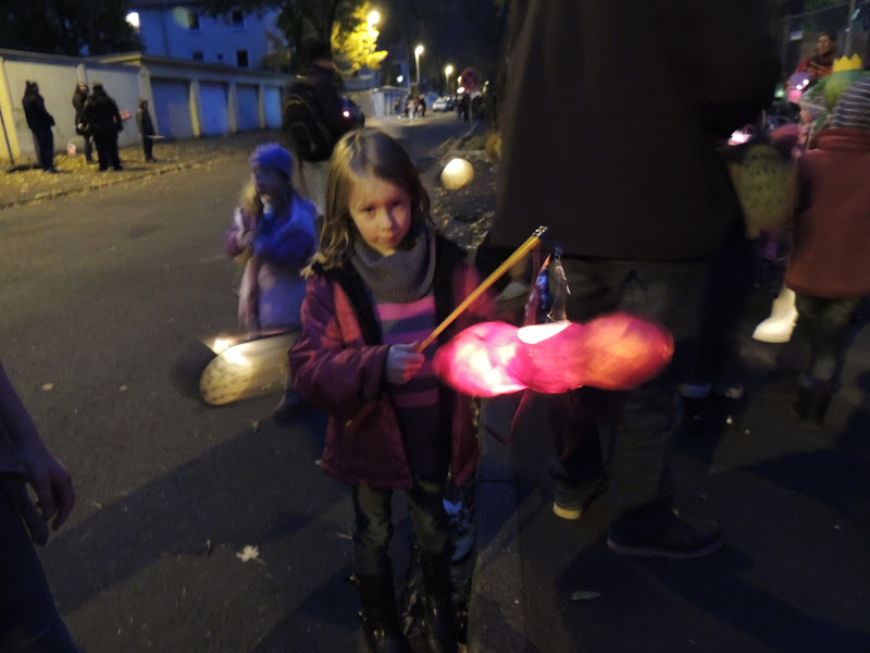 A normal morning, then a crazy afternoon: picked GE up early from KG so that she could come to ME's Klassenfeier (class party). The kids had prepared a few things to share: a song played on their recorders (I think it was a traditional St. Martins tune) and a reenactment of the story that led to the Roman soldier being sainted. J was at the party but had to leave as folks gathered for the parade because he was slated to give a presentation at the Juridicum (law school), so then I was on my own with all the girls. By 5:15, the school yard was beginning to fill with parents and kids carrying lanterns. We waited first with GE's Kindergarten group and watched the soldier, "St. Martin", ride in on a *huge* horse leading a band playing St. Martinzug (St. Martin parade) songs. Then the parade followed the horse and rider. The local Kindergartens fell into line behind the Catholic school kids, then the Bodelschwinghschule kids followed the Kindergartens. More music groups were scattered in between, so there were always flutes, brass and drums playing the traditional songs. ME was with her 4th grade class. MK, HR, and GE were with me with the Kindergarteners. Then, realizing, how hard it was going to be to find ME in the throng of people, we decided to fall back and wait for ME's class to come and walk all together. A good idea because it really was a MOB! The parade wandered slowly through the neighborhood, taking the LONG way around to the sport field where there was a HUGE bonfire. By the time we arrived there (45 mins after leaving the school!) GE was completely wiped out. Actually, we all were! By this point, I was carrying everyone's lanterns except the two older girls, plus my purse, the bag of extra candles, lighter, batteries, etc. Thankfully some friends were with us and gave GE an occasional piggy-back ride. From the bonfire, we went Schnörzen (a sort of trick-or-treating where you have to sing a St. Martin song to get a treat) with a couple of GE's classmates and their parents. Again, a heartfelt thanks to Y's dad for carrying GE and helping her get in and out of the throngs of kids at the doors. The kids sang their songs at the doors of homes, businesses, and bakeries. The homes and businesses handed out sweets and the bakeries gave out freshly baked special sweet breads! My favorite organic bakery had a huge tray with a giant "St. Martin" shaped bread decorated with sweets that took up a good 1/3 of the front display window! The traditional St. Martin breads are white bread similar to sweet rolls and are often shaped like a gingerbread man with a little pipe in his hand, raisins for eyes and nose and buttons.